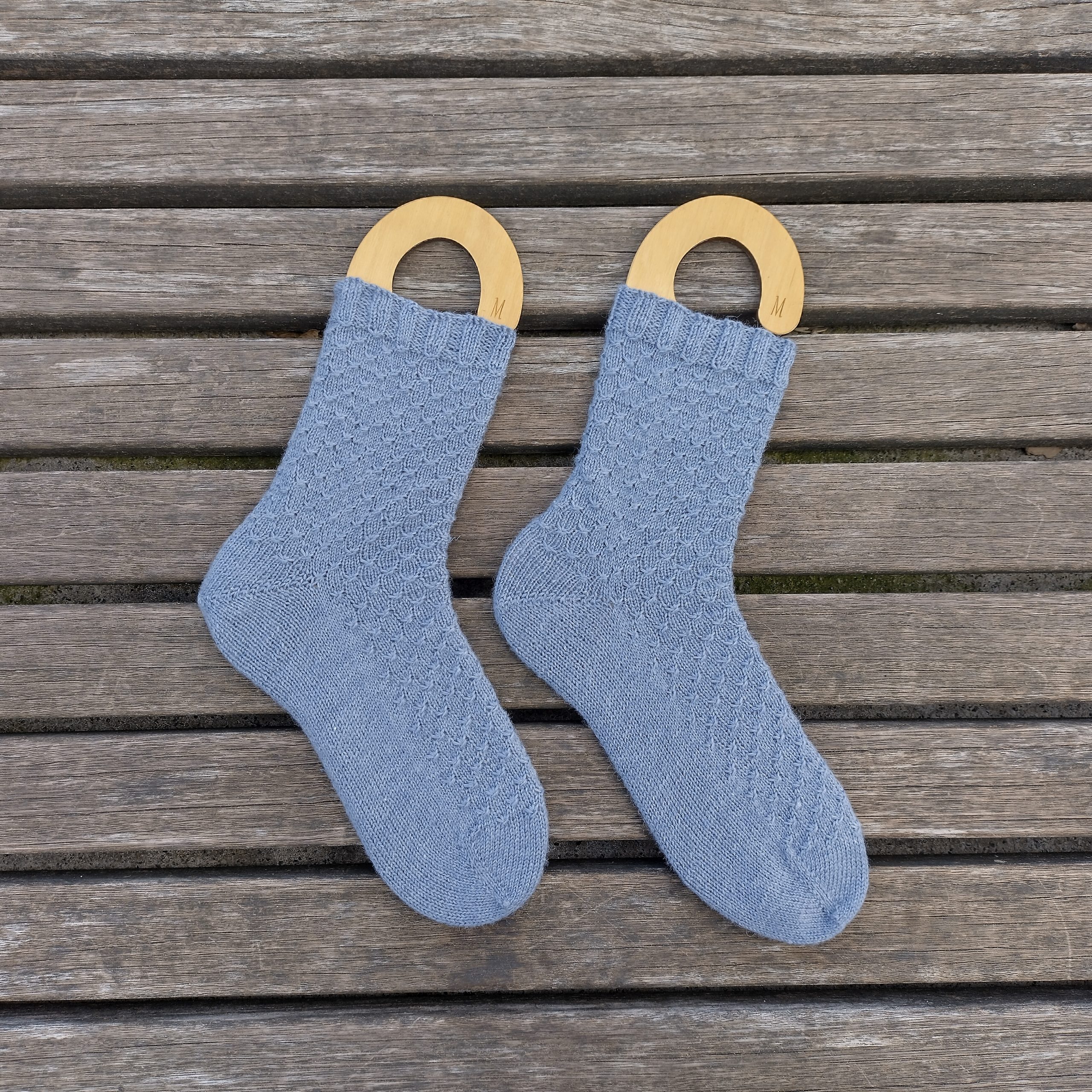 Diese Socken werden mit zusammengefassten Maschen gestrickt. Das Muster wiederholt sich wie folgt: Runde 1: Stricken. Runde 2: Stricken. Runde 3: (3-3, k3), für alle Maschen wiederholen Runde 4: Stricken. Runde 5: Stricken. Runde 6: (K3, 3-3), für alle Maschen wiederholen.
